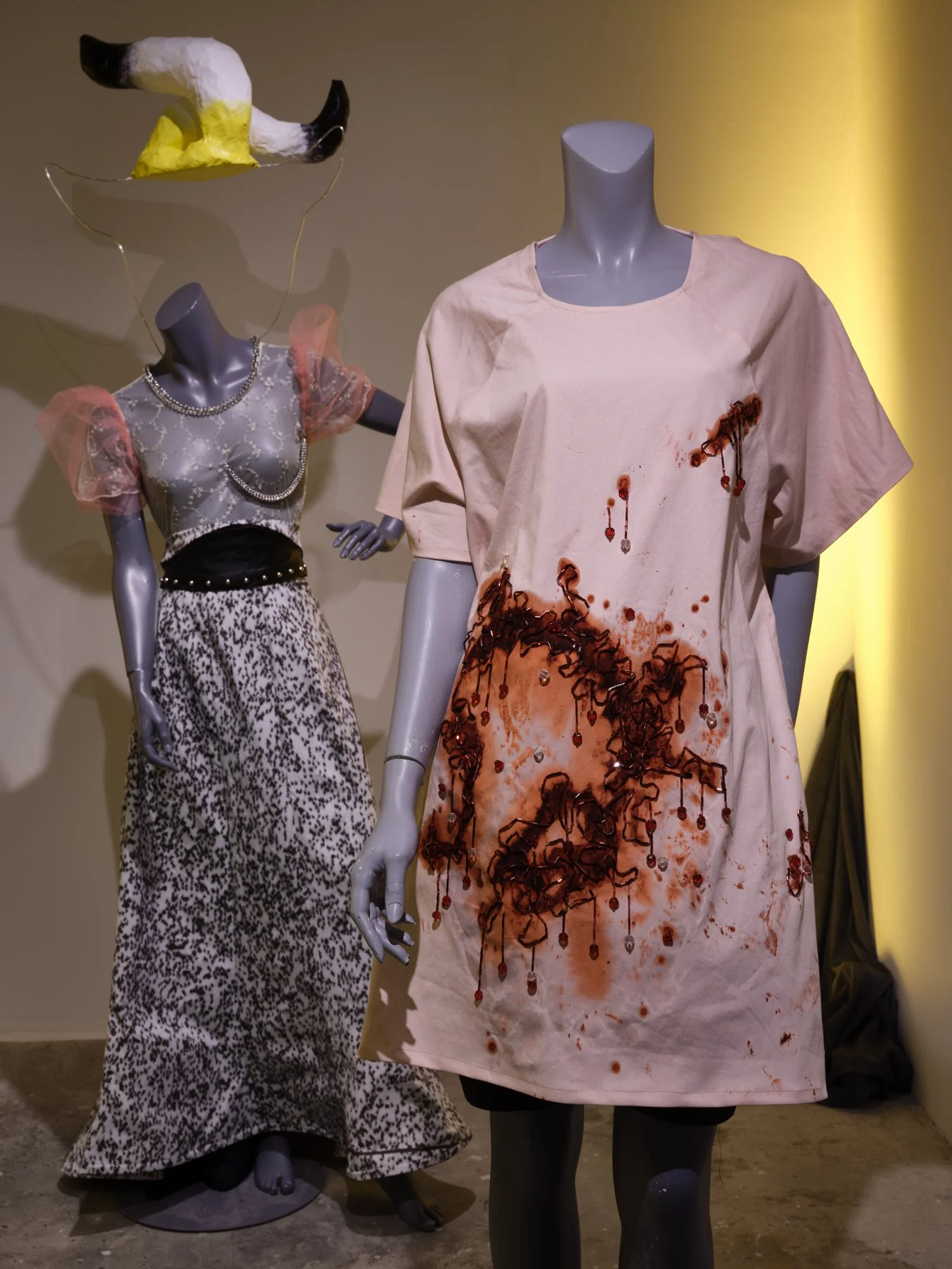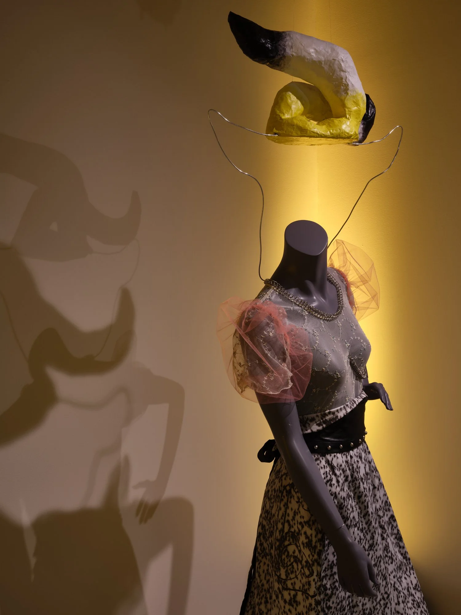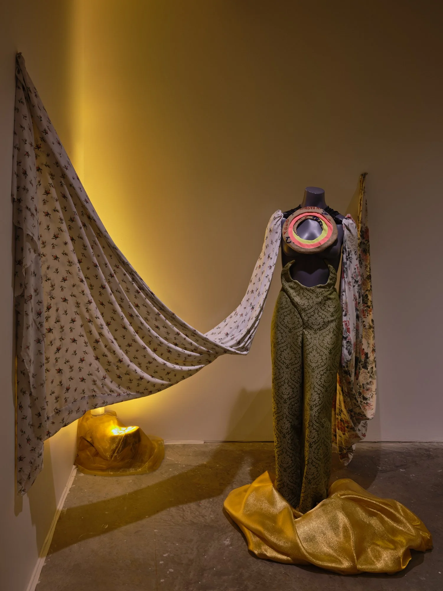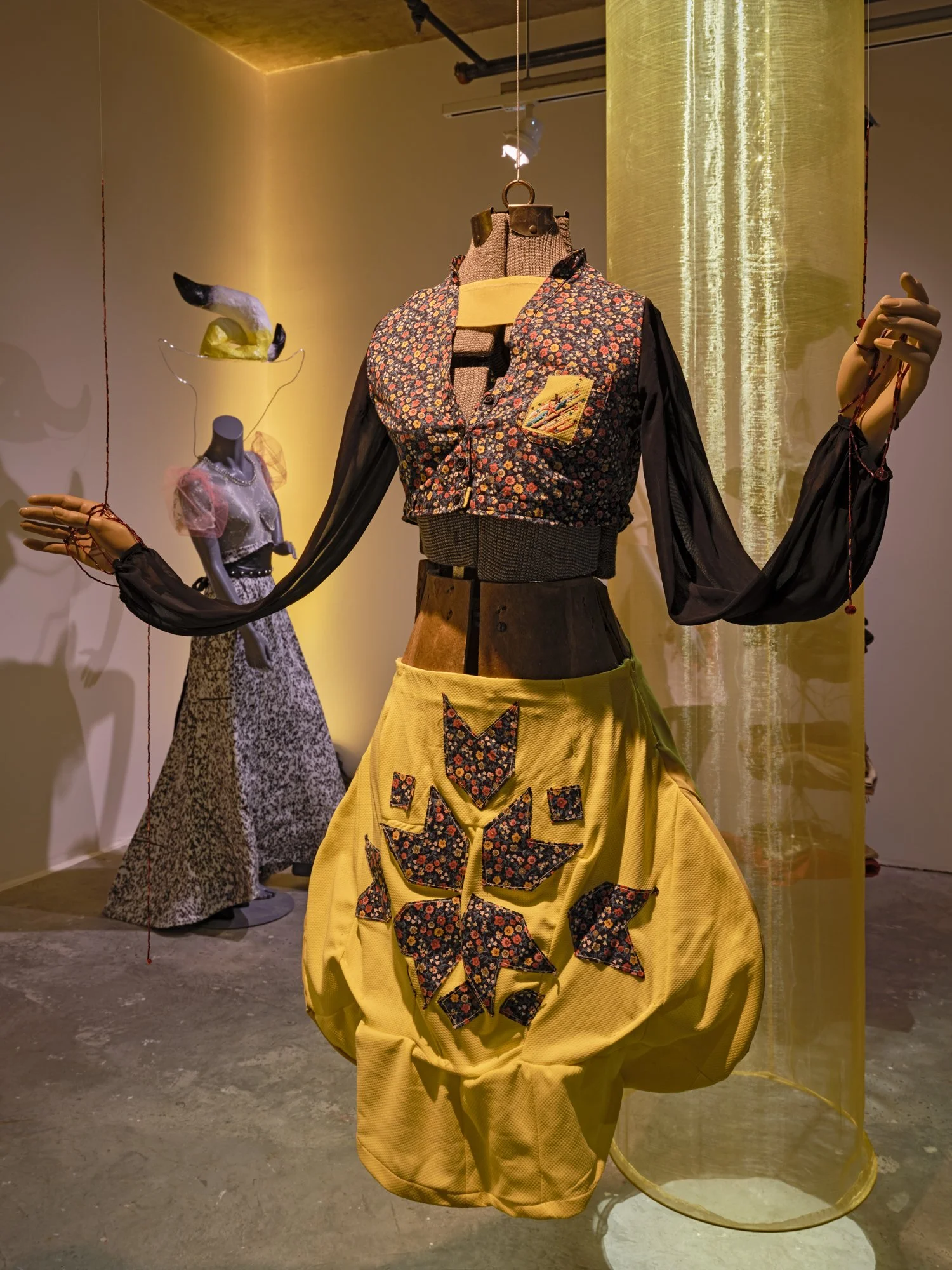 Across its three interconnected spaces, TechniCowlour invites viewers into a sensory dialogue that traverses the ancient past, the near past, and the present. One room binds light with absence; and houses retellings of pre-Zoroastrian deities in the form of costumes created from second-hand clothing. Another space envelops the audience in near darkness, where the intimate terrains of scent memories and tactile interactions take precedence over sight. The third space centres water, grounding us in the present—a momentary refuge entwined with the poetics of displacement and loss.