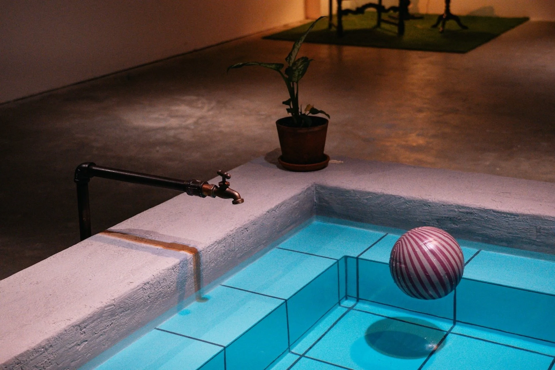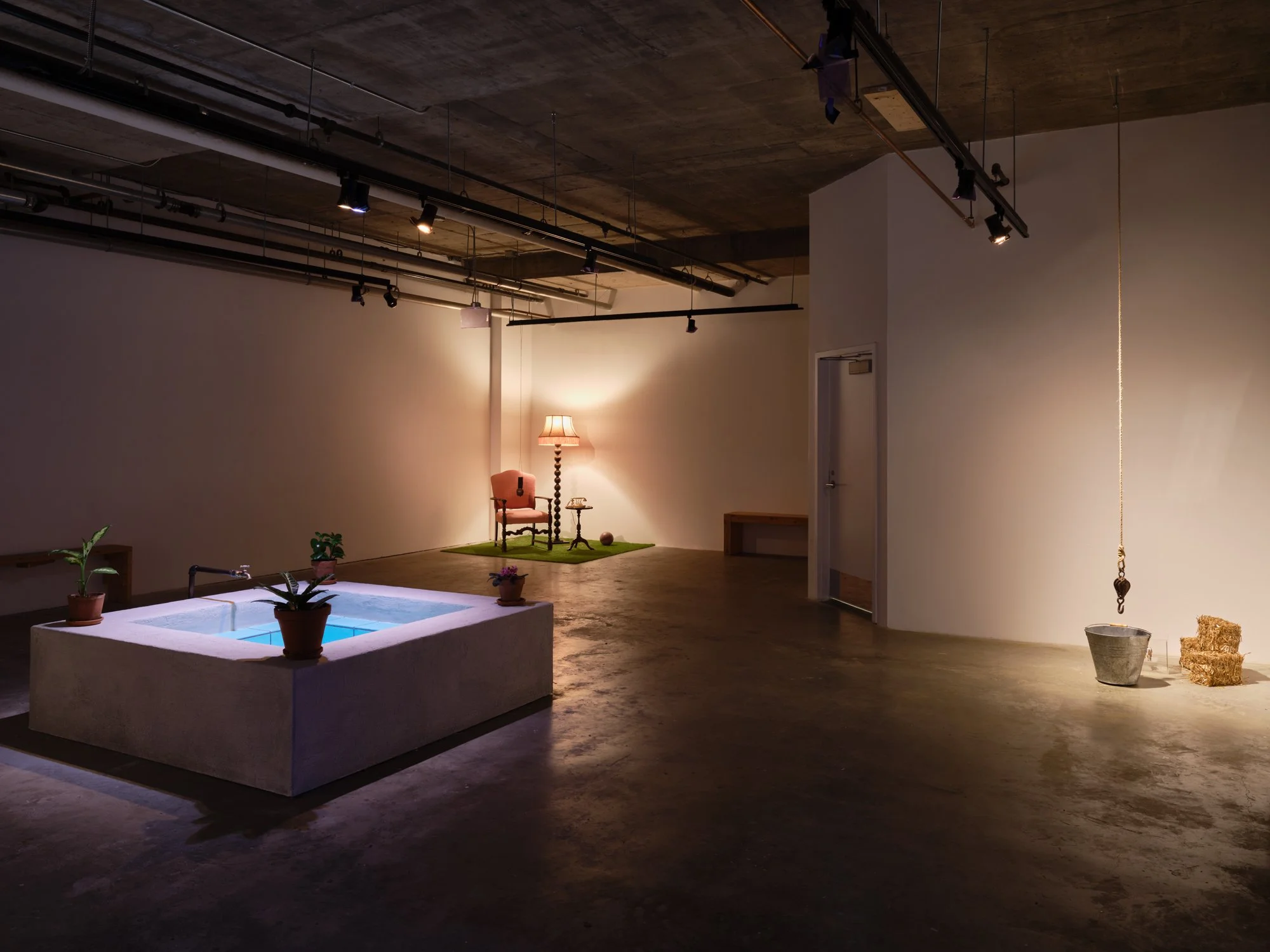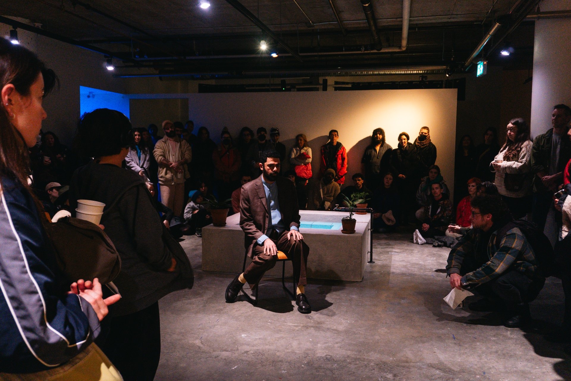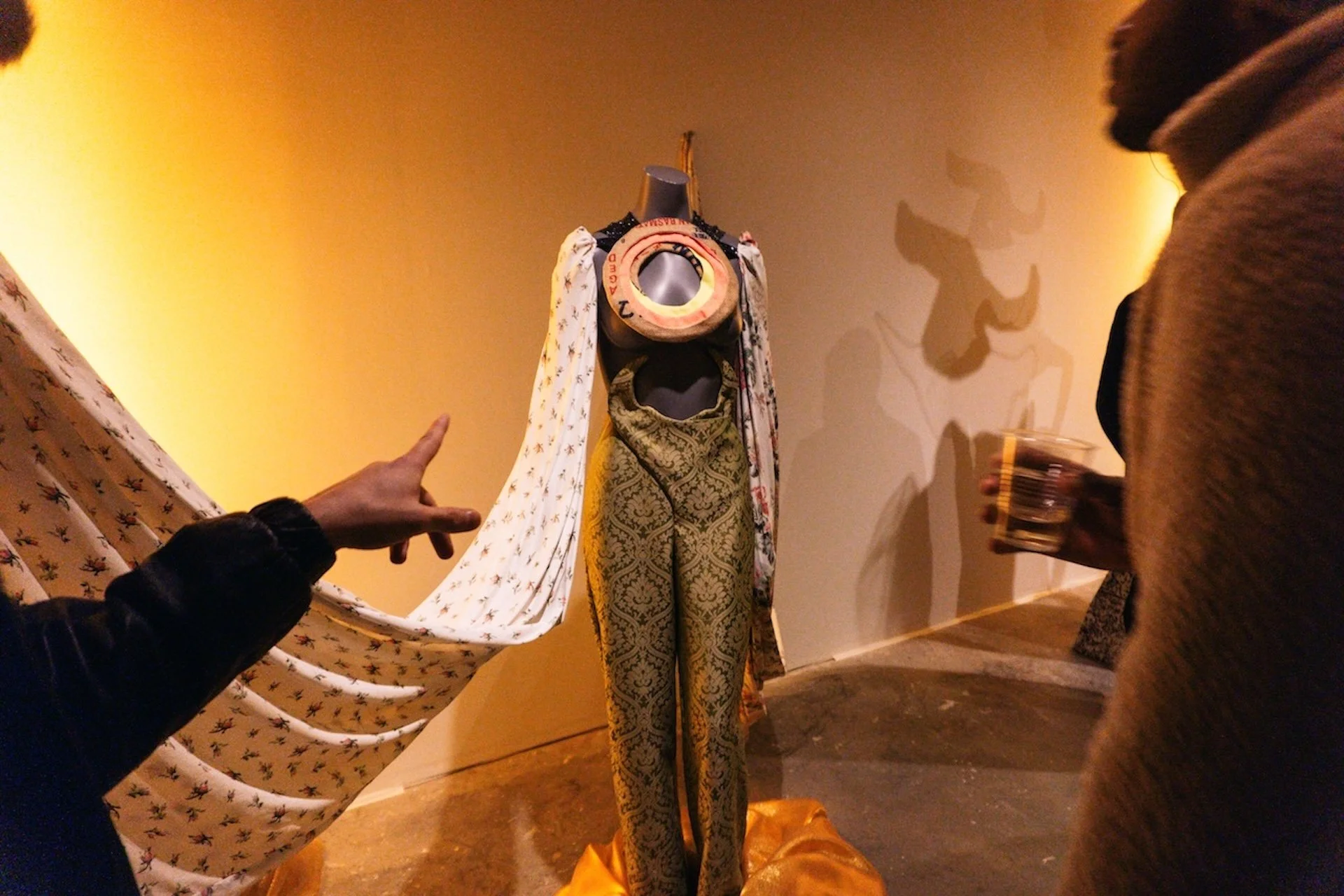 Across its three interconnected spaces, TechniCowlour invites viewers into a sensory dialogue that traverses the ancient past, the near past, and the present. One room binds light with absence; and houses retellings of pre-Zoroastrian deities in the form of costumes created from second-hand clothing. Another space envelops the audience in near darkness, where the intimate terrains of scent memories and tactile interactions take precedence over sight. The third space centres water, grounding us in the present—a momentary refuge entwined with the poetics of displacement and loss.